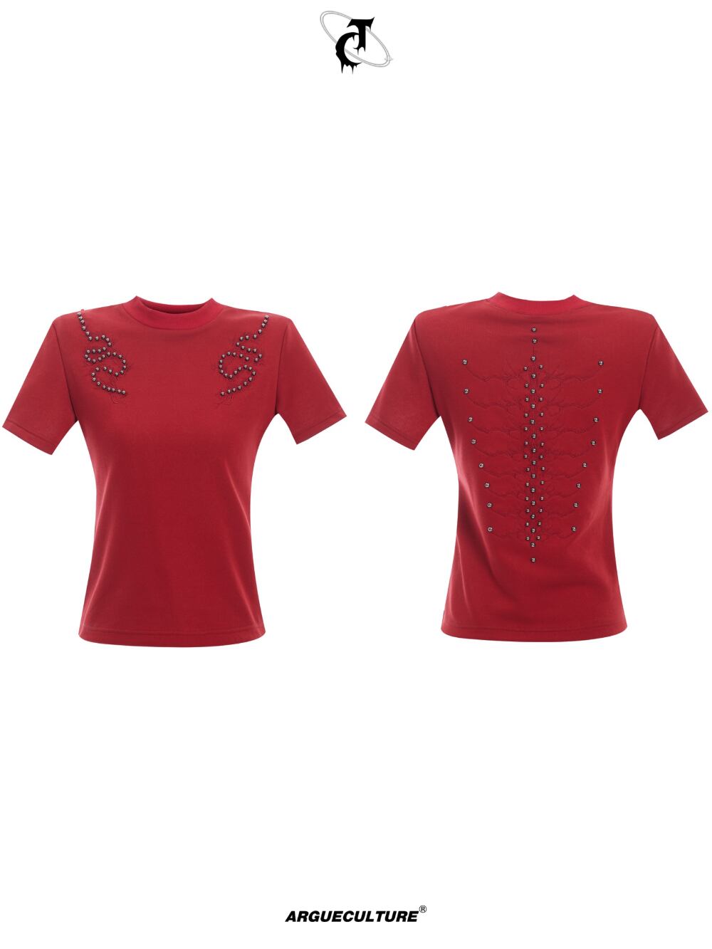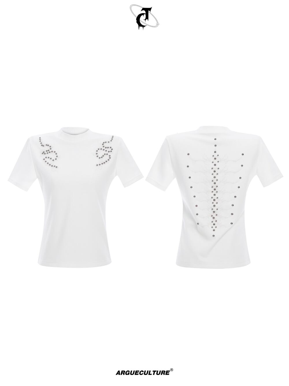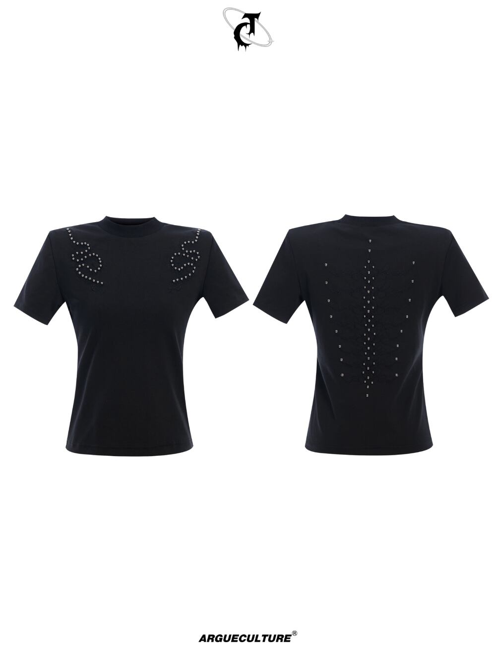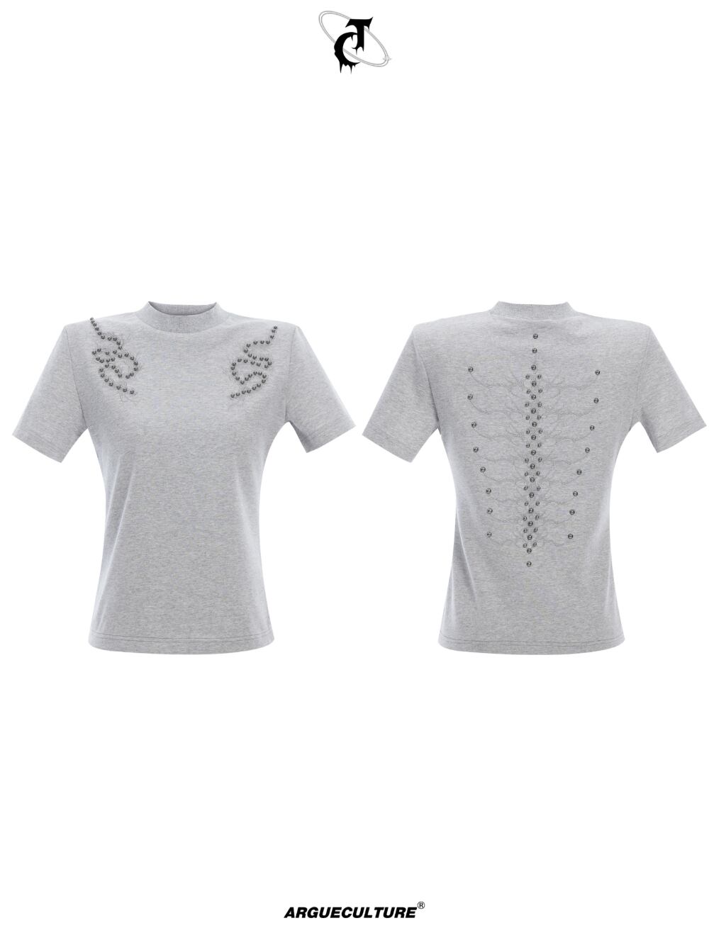Argue Culture スリムTシャツ半袖スタッズ入り刺繍プリント